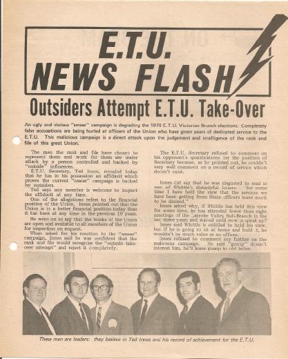 This was the era of the Innes dynasty with Jock Innes controlling the union in the first half of the decade and his son Ted becoming secretary for the latter part. Politically, the ETU had a close first name relationship with Federal Labor leader Arthur Caldwell and Victorian Labor with Clyde Holding and Bob Hawke. In his memoirs, Hawke described Jock Innes as a surrogate father while Ted became Victorian treasurer of the Labor Party and formed the Centre Unity faction with Hawke and Holding and then left the union to become a member of the Whitlam Government of 1972.